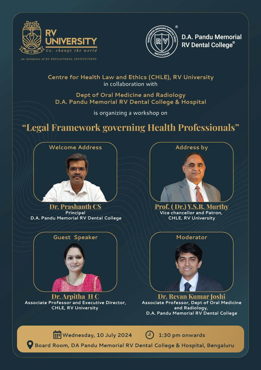 The Centre for Health law and ethics, School of Law, RV University, Bengaluru in collaboration with DAPM RV Dental College & Hospital conducted a workshop on “Legal framework governing Health Professionals” on July 10, 2024. The audience for the workshop comprised of dentists across different specialties wherein discussions on the medico legal issues faced by them and the solutions to overcome were discussed and this collaboration emphasized on having frequent courses and conclave on the legal aspects of healthcare.