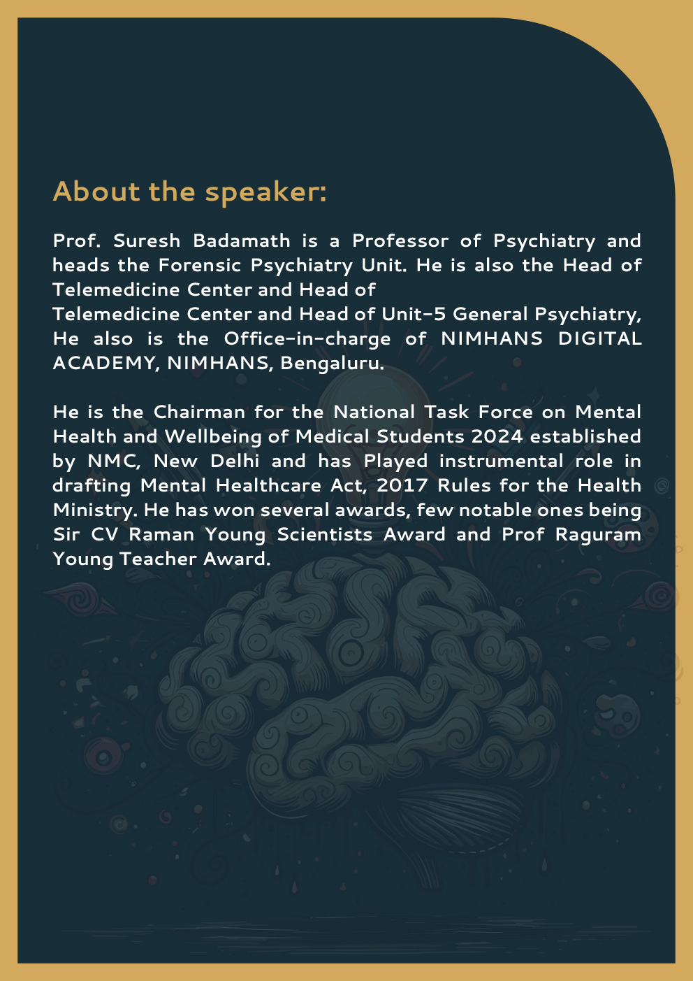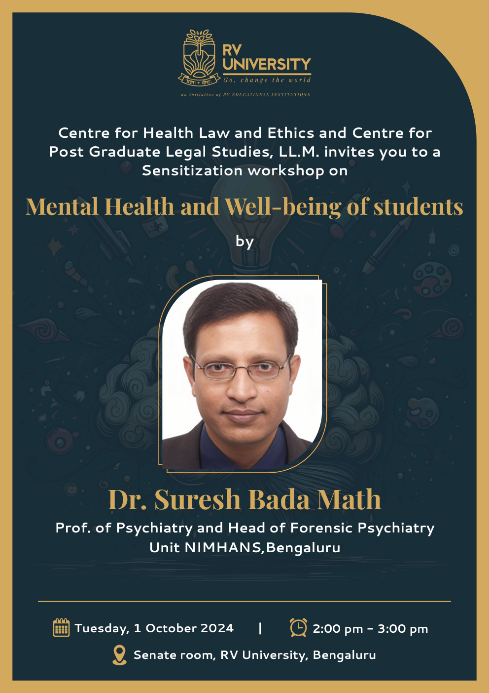 The Centre for Health law and ethics, RV University conducted a sensitization workshop for students on ‘ Mental Health and well-being of students’ by renowned speaker Dr. Suresh Badamath, Prof. of Psychiatry and Head of Forensic Psychiatry Unit, NIMHANS, Bengaluru on October 01,2024 at the Senate Room, RV University, Bengaluru