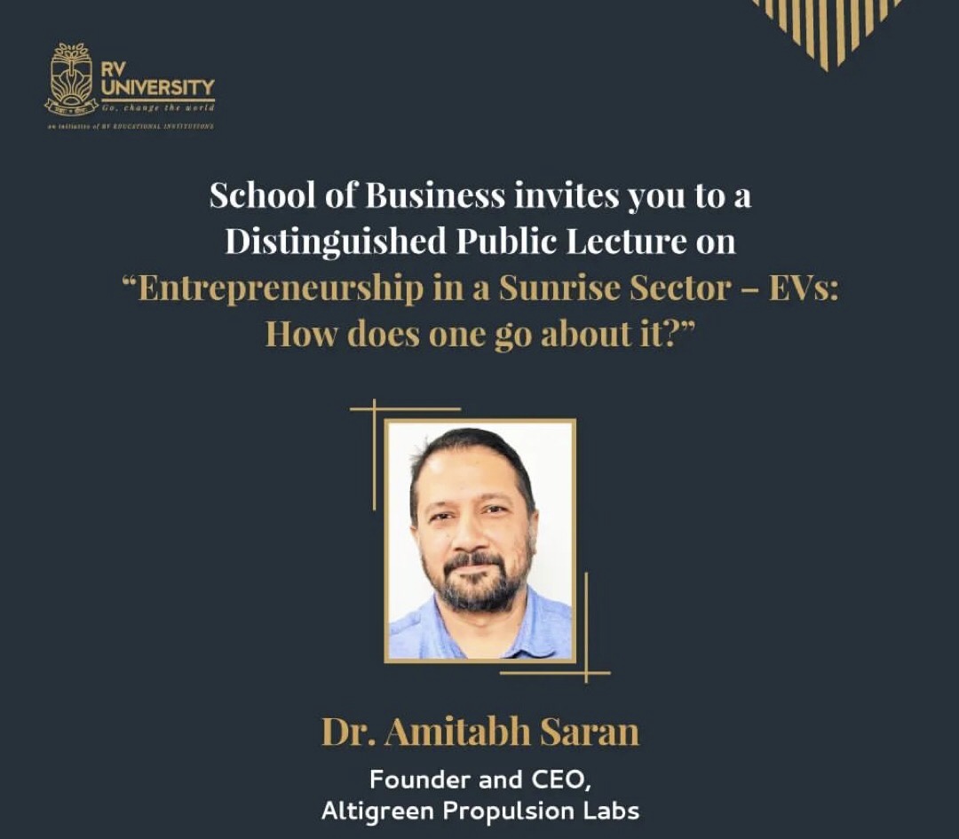 School of Business, invites you all to join us on November 25th, at 11:15 AM, as we welcome Dr. Amitabh Saran, Founder & CEO of Altigreen Propulsion Labs, for a Distinguished Public Lecture on “Entrepreneurship in a Sunrise Sector- EVs: How Does One G