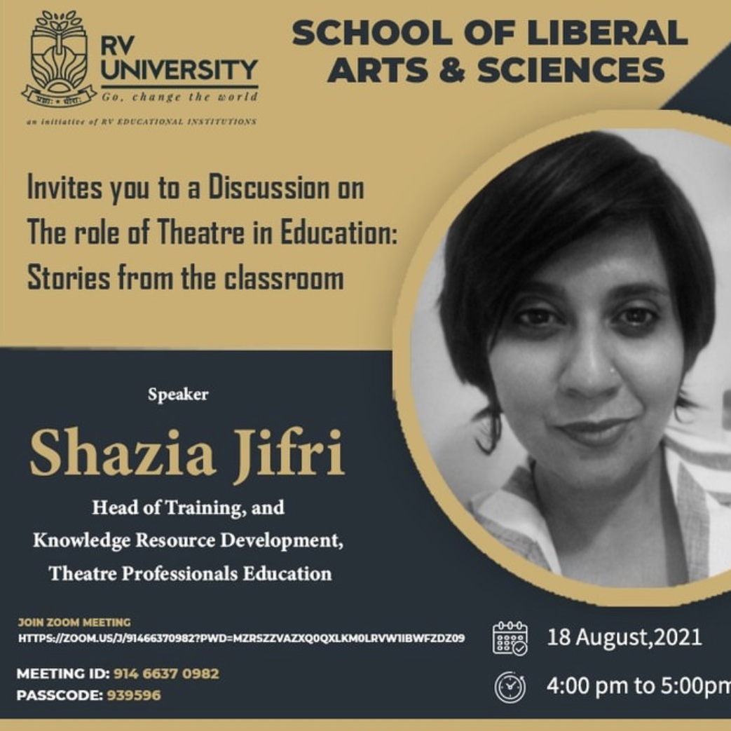 Join us at 4:00 pm, for an interactive session conducted by the School of Liberal Arts & Sciences, as Shazia Jifri, Head of Training, discusses ‘The role of Theatre in Education.’