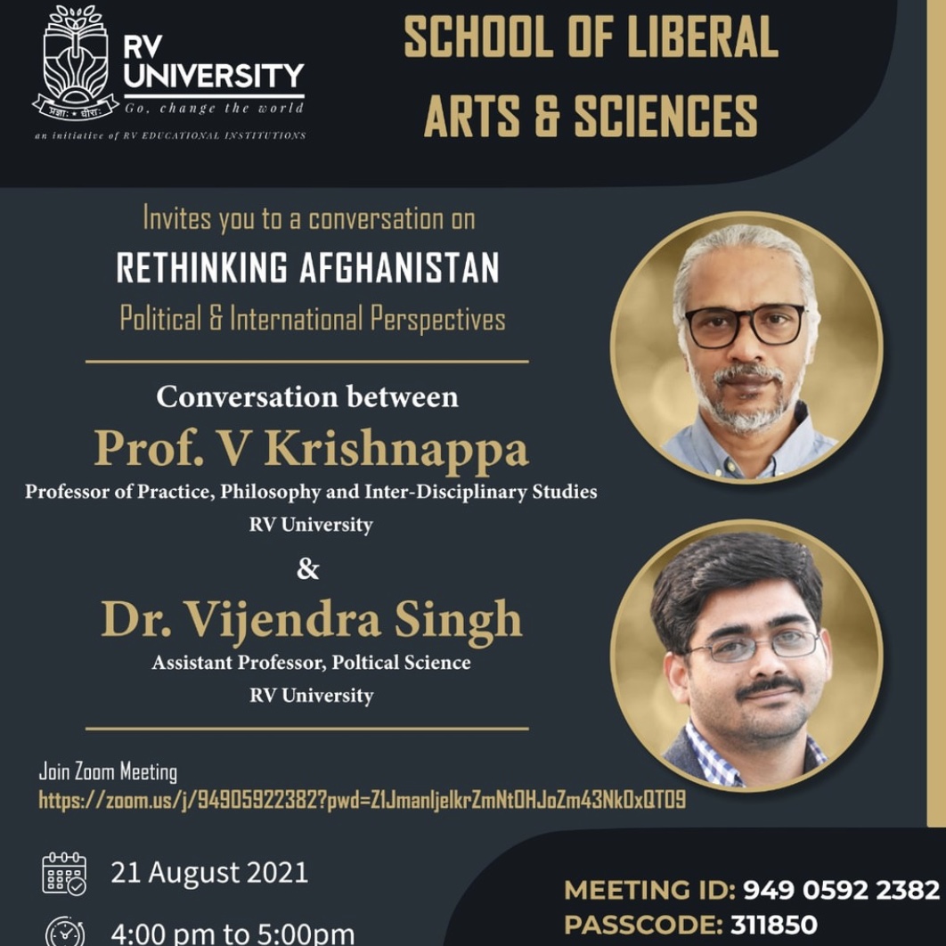 Join us on 21st August, Saturday at 04:00 pm for an interactive session conducted by the School of Liberal Arts & Sciences on Rethinking Afghanistan with Prof. V. Krishnappa and Dr Vijendra Singh.