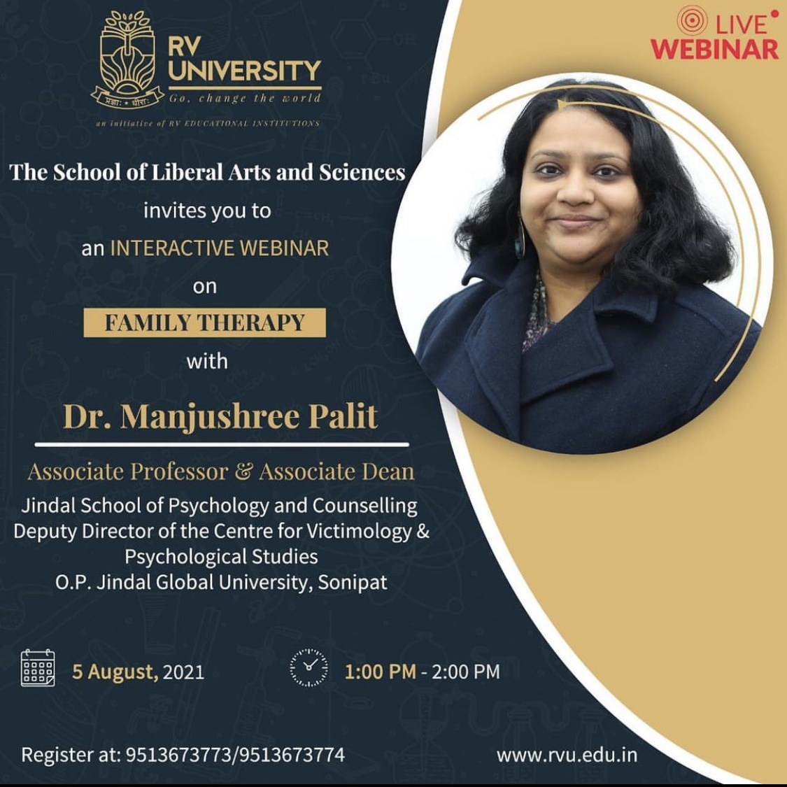 Join us on 5th August, Thursday at 1:00 PM for an interactive webinar organised by the School of Liberal Arts and Sciences on Family Therapy with Dr. Manjushree Palit, Associate Professor & Associate Dean at Jindal School of Psychology and Counselling