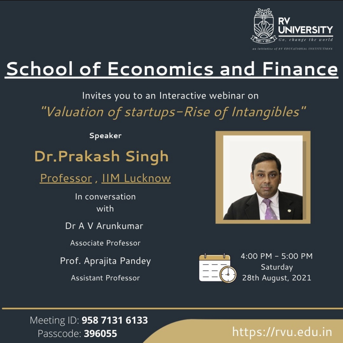Join us tomorrow, 28th August at 04:00 pm for an interactive webinar organised by the School of Economics and Finance on ‘Valuation of Startups – Rise of Intangibles,’ with Dr. Prakash Singh, Professor, IIM lucknow, Dr. A V Arunkumar and Prof. Aprajita Pa