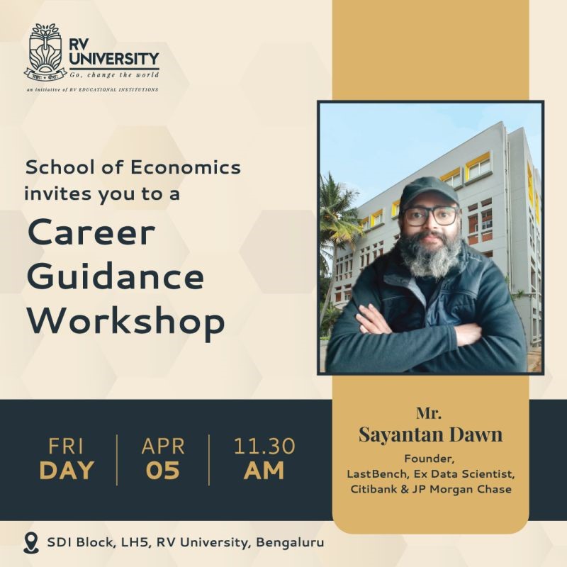 As a part of a very vibrant campus at RV University, the School of Economics and Public Policy offers a holistic education that creates critical thinkers with strong disciplinary understanding, broad perspective of issues gained through multiple lenses, and hand-on activities. As we launch our B.Sc (Hons.) and M.Sc programmes in Economics, we are excited to offer students a specialization in Data Sciences, Development Studies, Finance or Public Policy. Students are free to choose courses from a variety of courses within and more than 20+ courses outside of their disciplinary boundaries, and specialise in areas of their choice.